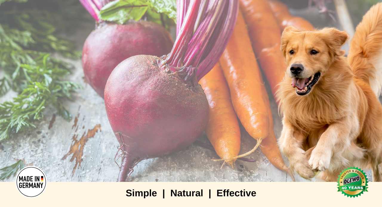 Developed in the 1970s, Olewo remains one of the original whole-food toppers for dogs — created to complement everyday diets using nothing but carefully prepared carrots and red beets.